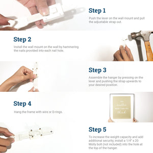 Single strap adjustable hangers change the game in picture hanging with their innovations in adjustability and durability. This two-part hanger features a D-ring-compatible hook on a slotted strap and a heavy-duty wall mount. The teeth on thehanger strap are only 1/16”, providing incredible precision when you adjust a picture. Tested and made with powerful nylon fiberglass, these wall hangers can carry beyond their standard weight capacity with the help of a Molly bolt.