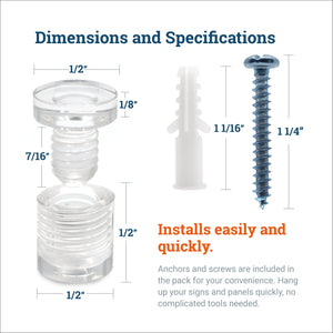 Sign standoffs are hanging hardware for mounting glass or acrylic panels. Also known as spacers or sign holders, this hanging solution allows panels to stand off from the wall by a short distance, providing a floating visual effect. Standoff mounting hardware is a great way to showcase your company logo and informational signs, making it perfect for hotels, restaurants, shopping malls, airports, offices, and other commercial areas.