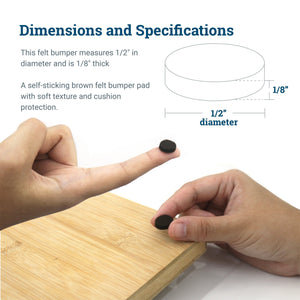 Self-sticking brown felt bumpers best used on frames, lids, cabinets, and other home furniture as slam protectors, drawer stoppers, and cabinet door silencers