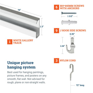 • Unique picture hanging system composed of a 79-inch (6.8-ft.) long flat metal wall track, nylon cords, large hooks, and hardware.