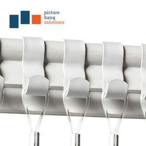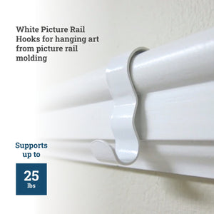 Picture railhooks are S-shaped hanging hardware designed to fit traditional wood picture rail molding (“Ogee" or "OG" molding) as part of a cable hanging system. Hanging pictures with picture rail hooks is damage-free with no drilling. Their elegance and great adjustability make them a staple in art galleries and museums, an appeal that also extends to enthusiasts who want to give their space the feeling of a real art gallery.