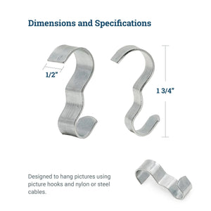 Picture rail hooks are S-shaped hanging hardware designed to fit traditional wood picture rail molding (“Ogee" or "OG" molding) as part of a cable hanging system. Hanging pictures with picture rail hooks is damage-free with no drilling. Their elegance and great adjustability make them a staple in art galleries and museums, an appeal that also extends to enthusiasts who want to give their space the feeling of a real art gallery.