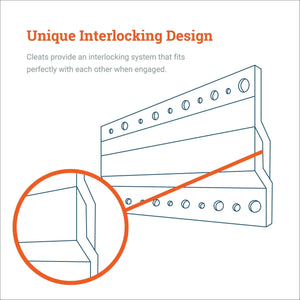 Aluminum bar cleat is 3/32 inch thick and made of aircraft-grade aluminum. Each French cleat is 1.25 inch tall. When interlocked, the pair is 1.875 inches tall. Wall standoff is 1/4 inch.