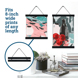 Using the piece with the leather hanger (the top piece), place the top edge of your print or poster between the two bars, with the magnets facing each other. Make sure to use the piece with the hanger installed in it as the back piece, as it will hang closer to the wall.