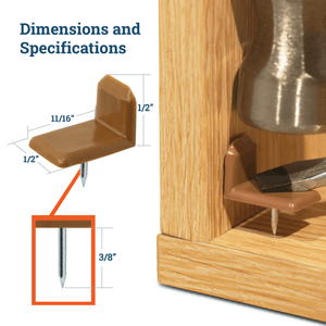Measures 1/2” long for the corner leg and 1/2” wide by 11/16” long for the nail leg, fitting most drawer door depths