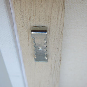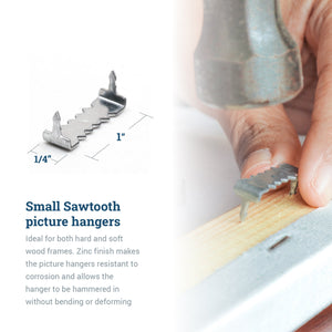 The small nailess sawtooth hanger is a two-pronged hanger that can be attached to a wood picture frame without screws or nails. Their tempered steel finish allows nailess sawtooth hangers to be hammered into position without deforming and installed quickly.