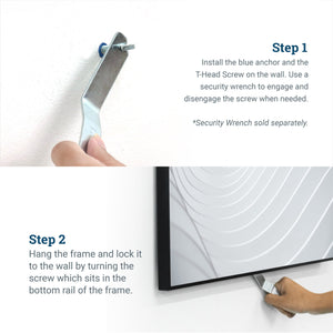 Install the blue anchor and the T-head screw on the wall. When engaged, the T-head screw must be positioned 2” from the metal frame’s side edge. Use a security wrench to engage and disengage the screw when needed.