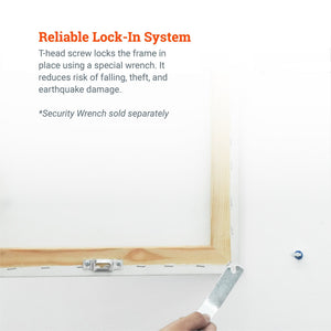 Hang the frame and lock it to the wall. Use a security wrench (sold separately) to engage and disengage the T-Head screw.