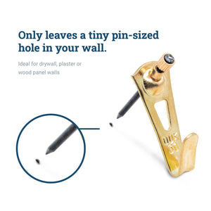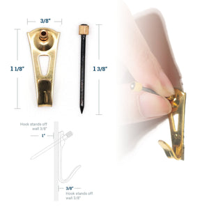Brass hooks are reliable picture hangers that provide additional holding power for pictures. They come with pointed brass nails to maximize wall support while leaving only a pin-sized hole on the wall to minimize wall damage. These professional picture frame hangers are used often in art galleries and museums.