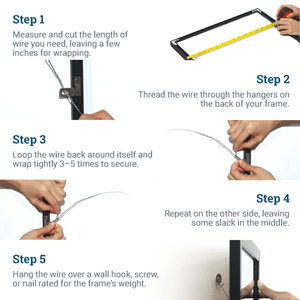 Hang the wire over a wall hook, screw, or nail rated for the frame’s weight.