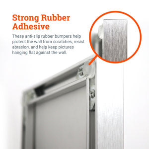 Note: For metal frames, dome-style rubber bumpers should be applied on top of the steel corner connecting plate at each of the frame's bottom corners, while wood frames should be applied flat-style rubber bumpers close to but not over the edge of the frame at each bottom corner. If more standoff distance from the wall is required, use our higher cylindrical rubber bumpers.