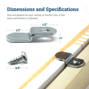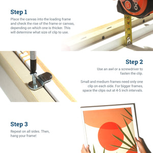 Canvas clips, also known as offsets, are L-shaped metal hardware that secure canvas art into frames with a shallower depth. One leg fastens onto the back of the frame while a second leg holds the canvas stretcher in place. Canvas offset clips are thus a quick, no-fuss solution for repurposing frames for canvas art. They come in three sizes to accommodate the difference between the canvas stretcher and the frame rabbet as they fasten the wooden canvas stretcher bars into the frame.
