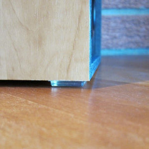 Note: For metal frames, dome-style rubber bumpers should be applied on top of the steel corner connecting plate at each of the frame's bottom corners, while wood frames should be applied flat-style rubber bumpers close to but not over the edge of the frame at each bottom corner. If more standoff distance from the wall is required, use our higher cylindrical rubber bumpers.