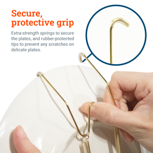 Plate hangers combine functionality and aesthetic appeal by providing an elegant solution for displaying your decorative plates. They stretch to accommodate most plate sizes without scratching them thanks to their soft padded rubber grips. They’re almost invisible from the front, creating a floatingwall art effect, and leave only a pin-sized hole on the wall.
