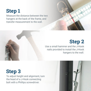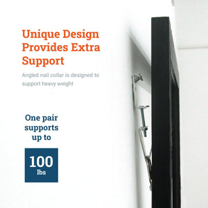 Adjustable J-Hooks are heavy-duty two-part picture hooks that allow height/level adjustments without removing the item hung on the wall. Boasting a 3/4" adjustment capacity, a J-hook’s lower section moves up and down and its upper section is adjustable while the hook is under load. This is thanks to a unique design with an angled nail collar that can provide significant support.