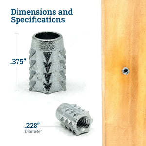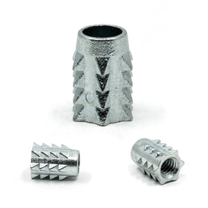A threaded insert is a cylindrical metal piece with internal threading, designed to be inserted into pre-drilled holes. It creates a threaded socket for installing screws, bolts, or other fasteners. These silver threaded inserts for wood provide a secure, long-lasting hold when joining wood, chipboard, and plywood.