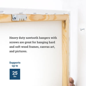Heavy duty sawtooth hangers are professional picture framing hardware that comes with pre-drilled holes. A small but mighty sawtooth hanger, this thick steel hanger won’t bend or break and installs in less than 5 minutes.