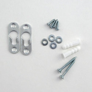 Includes two (2) keyhole hangers, four (4) #4 x ½” screws, two (2) #6 x 1 ¼” flat head wood screws, four (4) #6 flat washers, and two (2) #8 plastic anchors