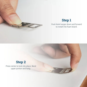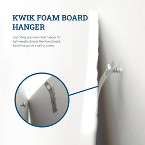 Kwik hangers are light-duty hangers that attach to foam board by four sharp metal prongs on its underside and an arrow-point anchor in the center. Foam board metal hangers are designed to hang posters or similar items mounted on foam board, (foam core board) or other lightweight backing board but are not framed.