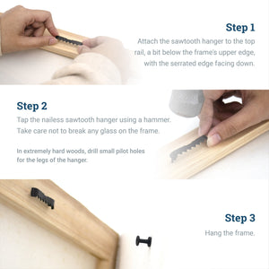 Use a small hammer to tap the nailess sawtooth hanger in place, taking care not to break the glass on the frame, if any. About 1/4“ of each prong should go into the wood for maximum support. When properly seated, the shoulders of a nailess sawtooth hanger should rest on the surface of the frame rail, leaving approximately a 1/8" gap between the back of the hanger and the surface of the rail.
