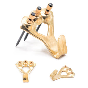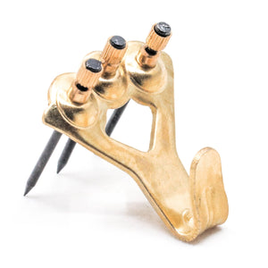 Brass hooks are reliable picture hangers that provide additional holding power for pictures. They come with pointed brass nails to maximize wall support while leaving only pin-sized holes on the wall to minimize wall damage. These professional picture frame hangers are used often in art galleries and museums.