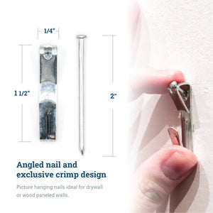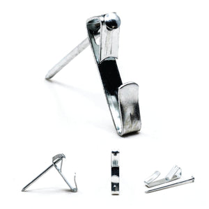 Conventional hooks, also called nickel hooks, are traditional hook-and-wire hangers with an angled nail and a special crimp design. These picture hangers are the framing industry standard and ideal for hanging art, mirrors, home decor, and other similar wall-mounted items.