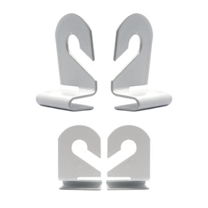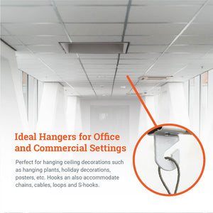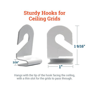 Drop ceiling hooks are two-part hooks designed for suspending items from drop ceilings, such as posters, advertisements, and ceiling decorations, making them ideal hangers for office and commercial settings. A drop ceiling hook hangs with its tip facing the ceiling and a thin slot for grids to pass through, with two hooks creating a closed-end hook.