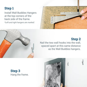 Install Wall Buddies Hangers using the screws provided. Left and right hangers are marked. Depending on the weight of the frame, it may not be necessary to use all screws.