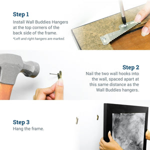 Nail the two special Wall Buddies wall hooks into the wall, spaced apart at the same distance and as level as possible. The wall hook nails should be located on the wall approximately about 1" lower than the position of the hangers on the frame.